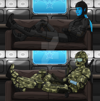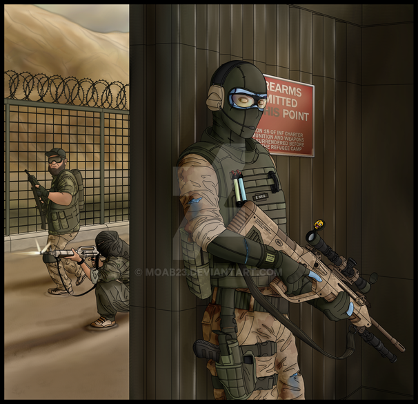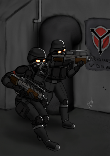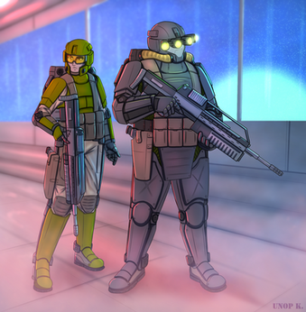 Ayden Sato and Saela Kagora prepare to storm a corridor of ENL members aboard the Ganymede rig, circa 2114. Updated.A few sweeping changes aside from the details and proportions upgrade. Equipment relocated/added, weapons updated, Saela given a KRS and her anatomy corrected. I had considered using my more detailed take on TEPAT camouflage, but then wondered whether that would be worn in an exclusively indoor mission. I may do it in the future, but for now, I've gone with some SAS-style 'black kit'.