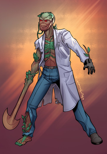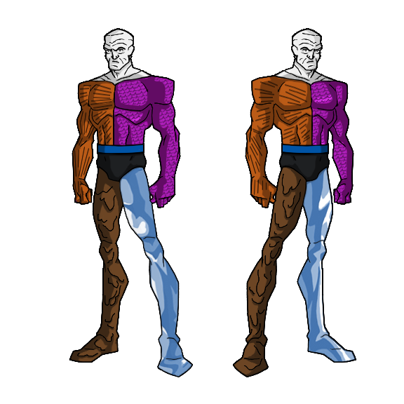 There’s a really interesting and creative idea at the core of Metamorpho’s appearance, undermined by how overly simplified and cartoony it is. I kept the general colors and their placements, but made them asymmetrical to make them feel random and organic. I tried to make him out of materials that felt like they could be found in the human body to further reduce the cartooniness (his right leg is basically softened flesh, like Clayface, and his top-left is caused by his blood crystallizing) with only his left leg needing a major change. It’s variously been drawn as either glass or pale wood, neither of which was I crazy about. I ultimately modeled it after charcoal, which is an organic form of carbon (the second-most common element in the human body) and can at times look sort of like a mineral or sort of like wood. I kept his silhouette completely human, as a painful reminder of how ruggedly handsome he once was.