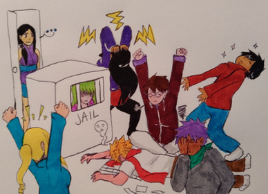 Then I created my own persona. A certain neko wearing glasses. Samuel will always carry that with him. He's filled my neko life for years as a key character and mascot. His pin is a combination of my and his pins. There's the black cross shape in the prison, Sam's to be exact, and his gold core, the [red + blue = purple], and the red ribbon that's been tied on Callie for years, which also acted as her Curse Siegel.