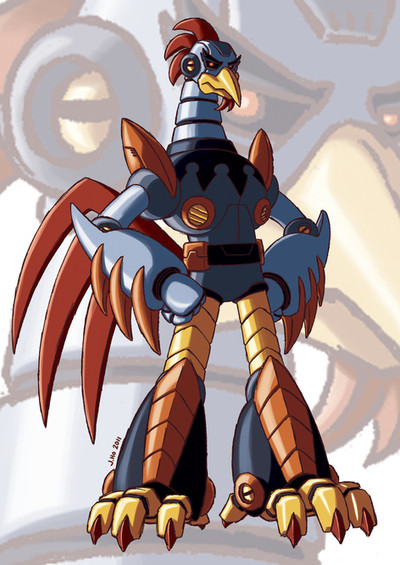 Character Bio:One of Robotnik's robotic generals and one of his first creations. As head of the flight squad he possesses the power of jet-powered flight and rocket launchers from his wings. Based of a chicken, Scratch has a fierce pecking ability that enables him to peck through solid steel with ease. Like most of the robots in Robotnik's arsenal, he is cold, ruthless and knows no remorse, believing that the only way of living was by his creator's command.