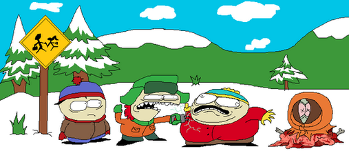 Stan and Kyle (and Cartman and Kenny, from left to right) from South Park (insert disclaimer here), attempting to match the style used in the show, 'cause this one would have been a pain in the ass for me to attempt in anime style. Sketched on paper, but then done completely in Photoshop 7.0. Took both way too long and, at the same time, very little time at all.So, um, yeah... this one was an idea thought up by , but I liked it so much and had it lodged so tightly in my brain that... I had to draw it. It was heavily referenced in an attempt to get all the proportions and expressions accurate to the style used in the show... (to the point where I kinda sorta traced the shape of Stan's jacket.)