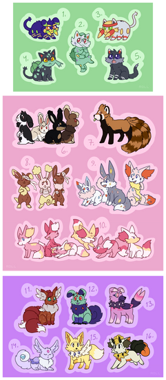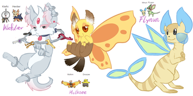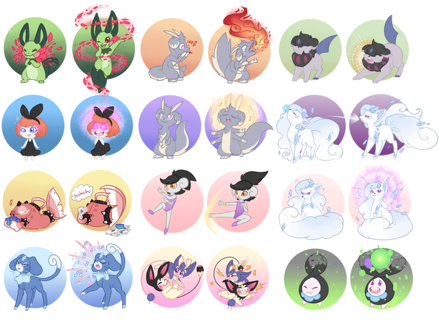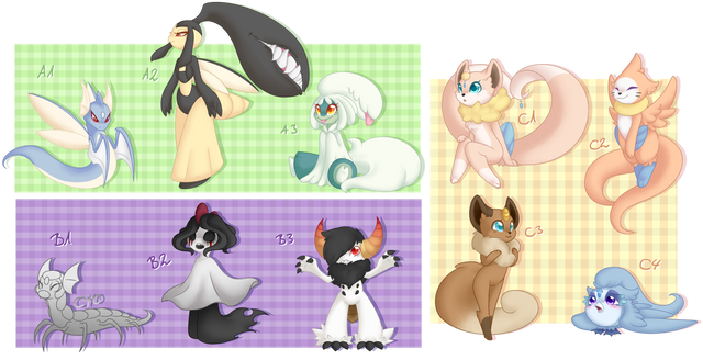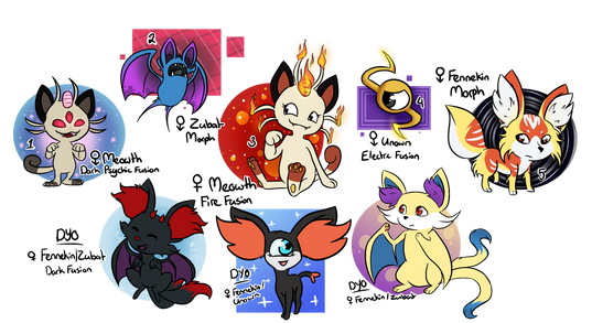 Well, I'd say this is very creative and I love the way you gave them all different poses! I can't really pick a favorite but my top three consist of Fluffy, Beauty, and Two-Face. I do think that they really do all have the same face though (except Ghost and Rapunzel) I love how Pointy and Bicker are fighting, and I find Majestic pretty cute. He reminds me a bit of Rockruff: bulbapedia.bulbagarden.net/wik⦠. Keep up the good work. I hope you put a skitty fusion in one of your auctions, I'd love to buy one >.< I would suggest at least a little bit of shading though.