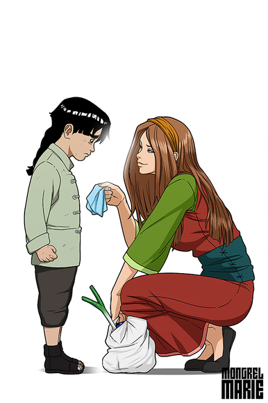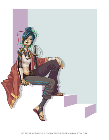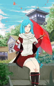 Back in 2015, I commissioned an artist for her design. I just specified that I wanted a green haired shinobi girl with Amegakure apparel (hat, cape, etc), and she pieced it together!