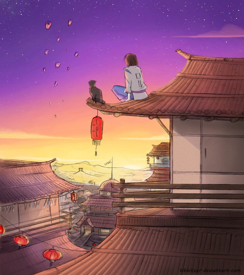 Every roof, pipe, and wire of the background is intricately detailed. Even the gorgeous, granulated sky is packed with those pretty white birds! Everywhere you look there's a joy to behold!
