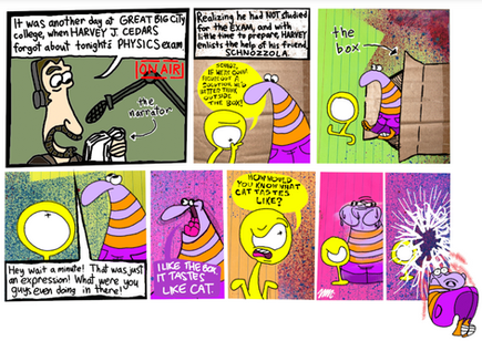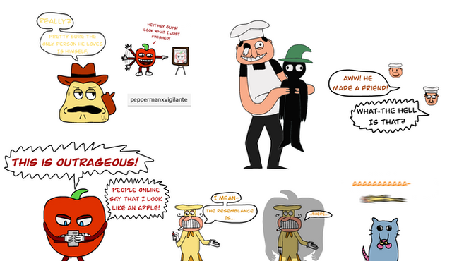 The exploding chicken really adds to the piece, I think...but try not to go overboard on the word bubbles...let the images speak for themselves.
