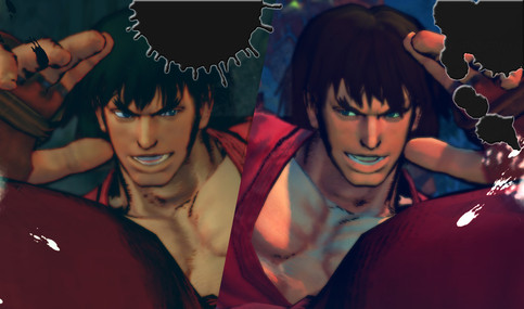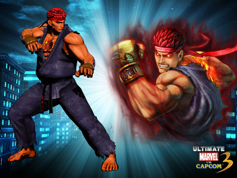 The old Evil Ryu often appears as a palette swap of Ryu wearing a black gi, although though the Alpha series also gives him a black head band. His skin also becomes a slightly darker shade along with his hair. his eyes glow in white and bur his hair doesn't change color.So I redrawn his eye ,cloth and faded out his chest and back and make his skin looks like the normal Ryu.You can see on the pictureHope you enjoy it