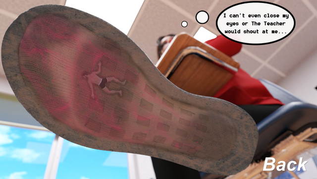 Arianna was the senior class's official mean girl but, she was hot and people let her get away with far more than she should. The strange thing about her was that any time someone stood up to her bullying they'd go missing for a few days and occasionally, permanently. When they came back they were often completely terrified of her.One day you made the mistake of telling her to shut up after she made a particularly rude comment about a friend. She was taken aback for a minute, then simply walked off as if nothing happened. Later that day when you were walking to the bathroom, you were about to turn a corner when a hand grabbed your shoulder from around it. You jumped and turned to see Arianna with her hand on your shoulder but, something was off, your never landed from your startled jump. You looked down and saw the ground rapidly leaving you. Arianna was gripping your shoulder hard and her hand was getting bigger, or rather, you were getting smaller. In a matter of seconds you were less than an inch tall dangling from her manicured fingers. She smirked at you. "Have you ever wondered what happens to the pathetic bugs that think they're above me? I turn them into actual bugs, just like you." She tapped her index finger on your face as if to touch your nose but her finger pad was the size of your face, causing you to swing wildly in her grip. Arianna started walking towards the library. "You're about to get a lesson about talking back to your superiors." she told you. The two of you entered the library, which was empty during class time. Arianna sat down towards the back where people walking by wouldn't be able to see her easily and kicked off her sneakers. She slid off her right stocking and held it in her other hand. She brought you over to it and dangled you above the opening where you realized what was happening. You thrashed wildly in her grip with no result. "You're going to spend some time thinking about what you've done in my sock. A bug like you should know your worthlessness." She talked down to you with such dominance - even more than usual - It would have been terrifying even if you weren't a bug about to be dropped into her stocking. When she finished berating you, she dropped you into the dark hole below you. You slid down the nylon, scrambling to grab onto the edges, but you couldn't get a handhold and slid all the way down the the toes of her stocking. It was here that you were struck with a the sheer power of her smell. The stocking smelled like it hadn't been washed in days and judging by the lint, dirt, and sweat stains collecting on the fabric, it hadn't. It was also quite hot, though not unbearable, like a blanket that was too heavy. You felt your nylon prison sway and saw the light from the top be cut off, leaving you with only what you could see through the dark translucent fabric. Arianna's foot made its way into the stocking, her toes wiggling and feeling their way down. You panicked and scrambled in the fabric as the ball of her foot caught you and pinned you up against it. The smell and heat became unbearable now that the source of both was pressing into your face. It was soft and covered in sweat that forced its way into your mouth and nose. If you were any smaller you might have drowned in it. That was when you realized your true powerlessness. If you nearly drowned in the sweat from her footΒ what chance did you have in fighting her?Β "You should be grateful, I'm teaching you a valuable lesson and you get to spend the whole day in my sock. If I wasn't such a benevolent goddess I would just crush you." You could barely hear her through the nylon. You felt your prison move as she planted her heel back on the ground. She lowered her foot slowly. You could do nothing but watch as you approached the ground. It pressed you up against her sole with such force. You could feel your body screaming in pain but, just before you felt like you'd pop, she lifted her foot back up. She placed it on her lap facing her. "Do you see now that I am your goddess? I could have squished you if I wanted. Pop! You'd be nothing but a smear on my foot. Lets get you somewhere a little less dangerous." She reached down with one finger and pressed you into her sole. She dragged you upwards across her sole to the toes of her stocking. "There, now I won't crush you accidentally." Arianna squeezed her toes together, pulling you in between her big toe and her second toe. She wiggled them up and down, tossing you violently and drenching you in sweat from all directions. "Now I can play with you during class. As worthless as you are, bugs like you make great toe toys. I love feeling your struggles so make sure you do or I'll squeeze you between my toes." she demanded. With that said she put her sneakers back on, leaving you with only darkness, stench, heat, and sweat. She made you her toe toy for the rest of the day and brought you home that night where she continued your torture. The next day she put you in the same stockings, now with an extra day of filth. Her toes were extra violent that day, grabbing you and pulling you nearly apart. At the end of that day she dumped you out unceremoniously and grew you back to size, she promised to give you another lesson if you told anyone or stepped out of line again. For the rest of the year she bullied you and threatened you with dropping you in her stocking again. You were glad to see her graduate and be gone from your life but, on the same day, her younger sister graduated middle school.