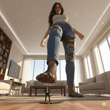 "Ugh, Kelsie's pets got out again. I don't understand why she keeps bugs like you around." Renee bent down and squeezed one gently between her fingers as she brought his terrified form up to his face. "You know I could squish you like the bugs you are right now." A devilish smile crept across her face. "Maybe I should. It would be a terrible accident." Her stockinged foot knocked over the pet still on the floor and loomed above him, hesitating. "Can I really look Kelsie in her innocent eyes and tell her this was an accident?... Well I'm going to have to. I'm going to enjoy this way too much to stop now." The foot once again bore down on the helpless tiny below, the slight rip on the sole spilling a rancid scent. "These stockings are my oldest pair and I haven't washed them in days. The perfect weapon for you pathetic tinies used to nothing but Kelsie's perfume." He was smothered by the scent and the foot, assaulted by heat as she slowly leaned into him. The smell of sweat forced itself into his lungs choking him as the pressure forced air out. His bones started to crack, her weight too much for him to bear even cushioned by her soft foot. She moaned with pleasure as he smeared across the floor. "Oh god that felt good. I could get used to being a vengeful goddess." She dropped the tin in her hands, breaking his legs as he hit the floor. He dragged his limp body in vain. "I'm starting to see the appeal of you bugs. Now a little screaming would really feed this new kink. If you don't give me some, I'll just have to crush some out."available in 4k on patreon