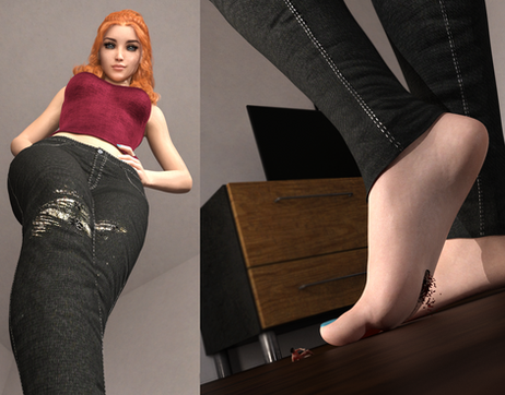 Walking out of the kitchen, Yvonne saw a tiny bit of movement beside the couch, but pretended not to. Her head was performatively in the clouds as she walked to the couch. To the group of tinies, it was in the clouds: oblivious and towering above them. They dashed for any kind of cover, thinking they hadn't been noticed. She plodded towards them, bare feet slapping the floor loudly as she approached. Her hair and chest bounced slightly in time with her steps, though it didn't take many to reach one of the tinies. She spared a quick glance downwards, and planted her foot squarely on top of him. It landed with a crunch. She peeled her foot off the floor with a sarcastic "oops." She bent down to look at the bloody mess that used to be a person hanging off of her foot. "You guys are so pathetic. Look at you, crushed to a pulp accidentally by a single step." She sighed and scraped her foot on the floor, directly in front of the other tiny grieving at her feet. It did less to clean off her foot than shred what was left of the body stuck to it. She turned her attention to the third tiny who was still fleeing and left the other with the bloody mess, pretending to not have noticed him. She sighed, "I may as well clean up the other one." Her foot left drops of blood across the floor, closer and closer to the one who fled. A shadow fell over him, then a drop of blood landed next to him, dousing his left leg. He tensed up and closed his eyes, waiting for the end and heard a loud thump in front of him. He opened them again and stared at the massive heel in front of him. "Oh no, I missed." Yvonne said with the same sarcasm as before. The heel raised up, baring her sole towards the tiny. Her foot dragged back toward her with the tiny right in its path. He made it a few steps before being overrun. He fell underneath the ball of her foot like a steamroller and was flattened as it dragged him across the floor. "How do you expect to be able to run from me when I can crush you without even realizing it? You're easier to crush than ants, at least they scurry away quickly." She turned back to the last remaining tiny. He saw her glance in his direction and hopelessness took over. He just stared up at her, utterly powerless against the ginger goddess. Yvonne swung her foot at him and snatched him between her toes. The shocked and vertigo-stricken tiny swung through the air in their pungent grasp. She sat down and planted her feet on the glass coffee table. "I'm going to watch tv for a bit, clean the blood from my feet before I'm done and I'll let you go, use your tongue if you must." He tried to wriggle free of her toes and just before he had gotten free she giggled and scrunched her toes, putting him right back where he started. He must have tickled her in his escape attempt. This repeated a few times before he finally managed to escape, carefully avoiding tickling her sensitive toes. He carefully scaled down her foot then scraped the wet blood off with his arm. It only took a few minutes but now he had to contend with the bits that stained her foot. With no other options he licked the stain. She burst out laughing, nearly throwing him off. He regained his hold and prepared to lick her sole again. The last one had tasted predictably foul; sweat, dirt, and blood clung in his mouth unpleasantly. He continued to lick, though now they were both fighting Yvonne's laughter, her stifling giggles and him barely clinging on as she did. Yvonne had stopped paying attention to the show she was watching, the tiny's struggles were far more amusing, and the tickle of his tongue made it hard to focus on watching. "I'll be honest I was just going to crush you, but you really know your place. Make sure you don't forget that I'm your goddess and worship me like this. We might get along." She pinched him between her fingers and brought him to her face. "I think you're done, you're way too tiny to be able to clean my feet quickly." She dropped him into her shirt to keep for the time being. He tumbled between her breasts where he stayed, unable to climb out until she decided to use him again.