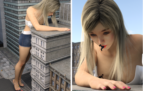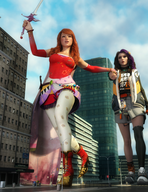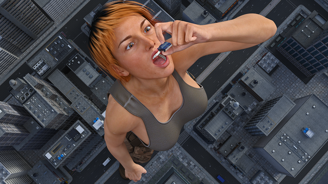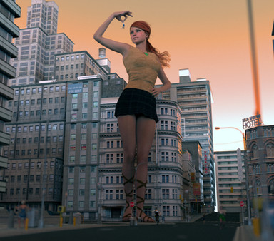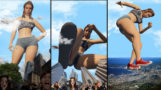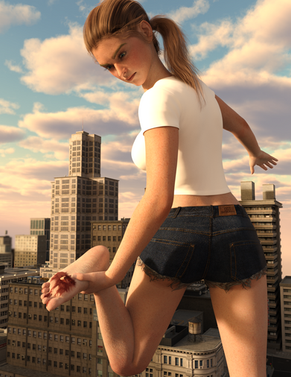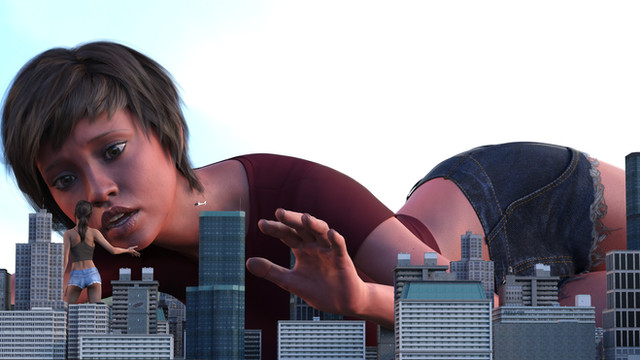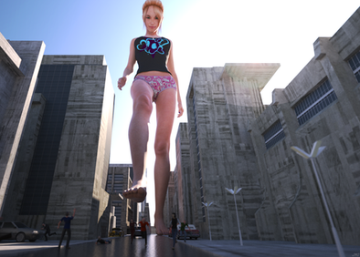 It had only been a few days since Ethne had become a giantess and she had already come to terms with eating humans. It was the natural order; she was the predator and they were the prey. Besides, it was that or cows and cows were filthy. So it was that she came into the city that would be her hunting grounds for today. She was careful not to destroy any buildings, it might make her hunting grounds less fruitful in the future, but didn't care for any humans that were on the streets. After all what were a few hundred people squished underfoot when she was here to eat just as many? She stomped her way to the center of town, occasionally stopping to scoop up a handful of people and toss them in her mouth. She loved being a giantess, especially the way humans would squirm uselessly in her hands and belly. It only reaffirmed that she was the apex predator and the humans were helpless against her. Once Ethne had made her way to the center of town she started her feast properly, chasing the humans and corralling them in the streets by blocking them with her feet. Hundreds of people found themselves trapped. Her hand came down every few seconds to scoop up a few more of them. She took her time now, enjoying their struggles and occasionally only grabbing one or two the she could dangle over her mouth for added effect. Even still, within minutes the hundreds of people between her feet were gone. She was finally full. She laid down in the middle of the street to take a nap while her meal digested. The scene inside her stomach was far more chaotic. Hundreds of people thrashed against her stomach acids, trying to pull themselves up against the violent sloshing, all the while the acids were melting them slowly. The screams of pain and terror went unheard from inside her belly but their struggles were just enough for Ethne to feel them. She smiled contentedly and rested her hand on her belly before she fell asleep, leaving them to their gruesome fate.Made with Destroy! for DAZ by GoddessTina