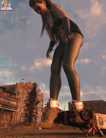 She noticed a survivor crawling away between the rubble and shifted her foot, pinning him effortlessly beneath her big toe. "Now where do you think you're going?" She kneeled down, not moving the foot pinning a small man, and grabbed another in her hand. "You're too disobedient to be my slave but, I suppose I could use a snack for the road." The man pinned beneath her toe finally gave into the pressure and popped. "One down." She stood up and began prodding a few tinies towards her sneakers with her bloodied toes. "Come on now I don't have all day." When they were all inside she tipped the shoes up and began to slip them on, then stopped. "I almost forgot." The remaining houses were crushed one by one under toes painted with teal and blood and anyone cowering inside with them. "There. That should have finished off any cowards who thought they could hide from a goddess" She slipped her shoes back on, this time for good. The tinies inside were smothered or crushed and the minutes-long walk home felt like years under the pressure. She wiggled her toes, enjoying the feeling of tinies struggling beneath them and popped the last tiny in her hand into her mouth.