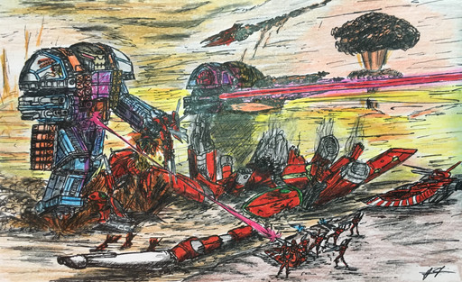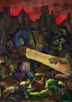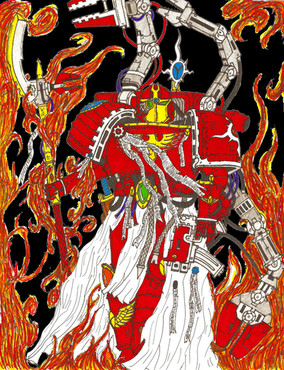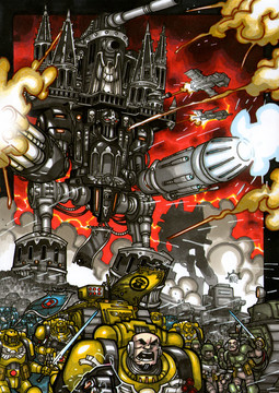 A3 paper with Polychomo pencils.Burning of Prospero with a Contemptor dreadnought looking awesome.