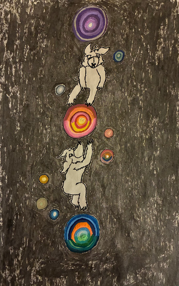 this is one of the few symbolic pictures I've done in a long while. the two characters in it are Echo (mine) and Pepper (love-of-foxes). He is supposed to be pulling her down into his own little alternate universe. Here, space and time are both visible (hence the clocks and planets). these are the only two things that are said to be of infinite value, which is why I titled the picture as such. The watery landscape below is supposed to show something 'flowing', think 'the flow of time' or space or whatnot.