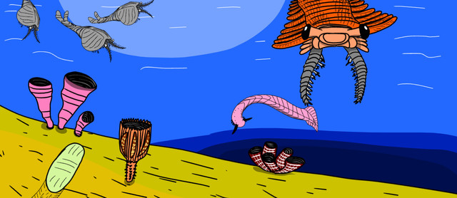 In the Cambrian seas, around 506 million years ago, a young adult Opabinia regalis, a stem arthropod species with five eyes and a strange feeding method - a mouth perched at the end of a long, arm like appendage, has traveled into shallow water, or at least what we would consider shallow water. Most Cambrian animals are quite small, tiny enough for someone to hold in their hand. But suddenly, it sees something.A bizarre shape sits on the ground before it. It is a Hallucigenia sparsa, named for its bizarre appearance - unlike any other creature ever found. It may be a panarthropod, a relative of velvet worms and tardigrades still alive today. It walks about on seven pairs of legs, somewhat similar to a caterpillar's false limbs. It has six feelers near its head, which it uses to find food. And finally, it protects itself from predators with spines all over its back. But its other senses are not particularly well developed - unlike the predatory Opabinia now stalking it.