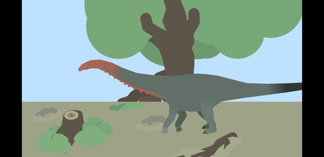 It is the male Orretherium - the father. He curiously inspects this larger newcomer, but suddenly, he realizes he has a visitor. One of his young followed, by jumping onto the Stegouros' rooflike tail, and running up to its back. Continuing its investigation, it eventually walks down the neck, and ends up on the armored herbivore's head. The Stegouros is confused, but still hungry, and decides to eat.