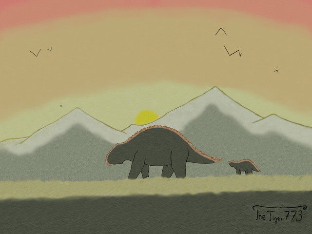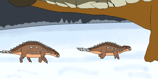 In late Cretaceous Patagonian Chile, around 73 million years ago, an adult Stegouros elengassen decides to briefly stop near a tree to rest; it spends much of its life on the move, to find new places to feed and evade predators. There is little vegetation here, but enough to hold the armored beast over for a few hours. But just as it starts to feed, it hears a squeak, followed by a hiss.It looks up to see an Orretherium tzen, an ancient mammal, a small omnivore. In more lively areas, they must avoid being stepped on by titanic dinosaurs, but here, they are completely alone - or they were, until the Stegouros wandered in. The herbivorous parankylosaurid is approached by a female - a mother. She is part of a family, that also includes her mate and three offspring. Two are behind her, hairless, and not much like their parent in appearance.