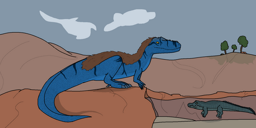 The Stegouros means them no harm, but steps away to avoid confrontation. But suddenly, it feels something brush its front leg. It looks down to see a burrow. It is shallow enough for the Stegouros to look into, and even see its bottom. It is empty; whatever brushed its leg must've scampered out. But suddenly, it feels something crawling up its side.