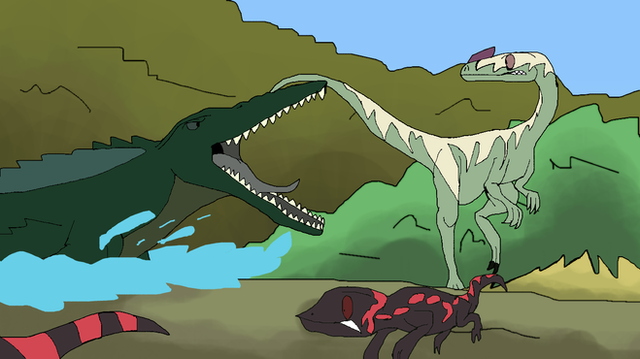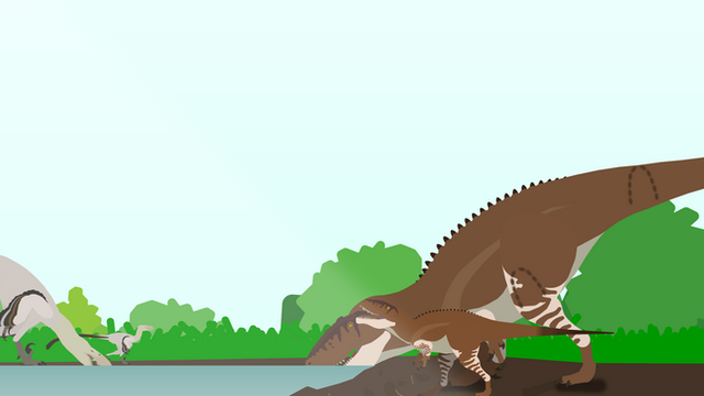 In mid Cretaceous Africa, around 83 million years ago, a juvenile Sarcosuchus imperator sticks its head out of the water to nip at a carcass at the shore of its shallow river home. The carcass belongs to a ten year old Paralititan stromeri, which was killed by a young Carcharodontosaurus saharicus, the apex predator of the region. Seeing the little crocodyliform bite at its lunch, the theropod responds in anger, roaring at the smaller carnivore. If the youngster doesn't slip back underwater in time, it may become the the Carcharodontosaurus' side dish.In the water that is still concealing most of the young Sarcosuchus, an Onchopristis numida sawfish swims about, occasionally sifting through the riverbed with its long nose to expose shellfish - its preferred prey. Meanwhile, a pair of coelacanths swim in the opposite direction, surrounded by three groups of smaller fish. A member of one group is unfortunate enough to get ambushed and killed by a snake that is hiding in the riverside mud. Another has established itself more towards the bottom, but it must come to the surface for air every now and then - a task made dangerous by the many other predators of the river.