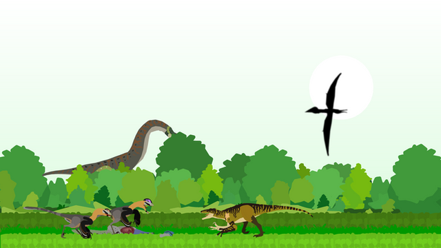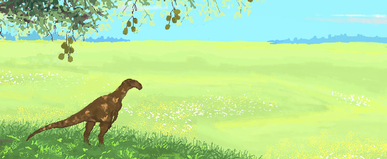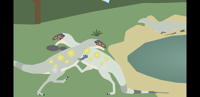 In late Cretaceous Mongolia, around 70-65 million years ago, a pair of female Halszkaraptor escuilliei, waterfowl-like dromaeosaurid dinosaurs, paddle around the lake they have come across. They are built for an amphibious lifestyle, but when living in the heated Gobi desert, water can be hard to come by. Fortunately, this oasis has provided them with enough water to frolick in. But they suddenly realize they're not alone.Sitting on the shore is a male of the same species, easily distinguishable by his brighter coloration, meant for attracting mates. He is looking for a partner, but things haven't started very well - being spotted in such a way does not make the best first impression. The females, perplexed, stop and stare at their observer, unsure of how to react.