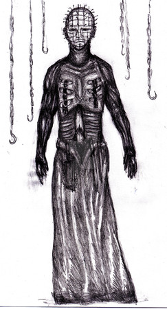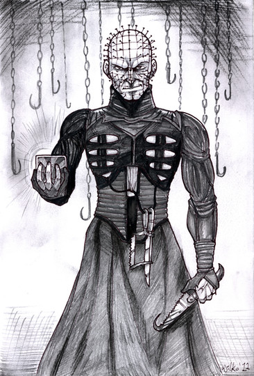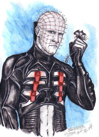 Pinhead from the Hellraiser movie series. Done on grey paper with prisma color markers and pens.Related content