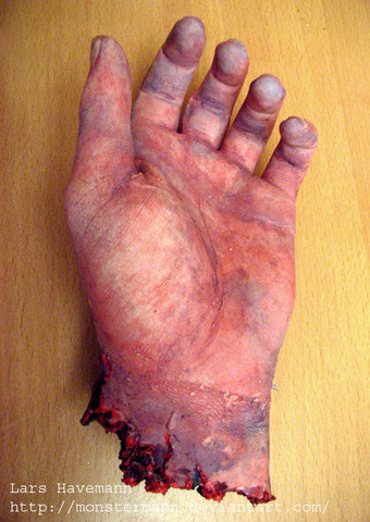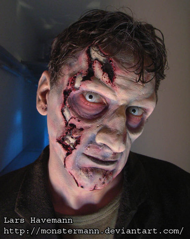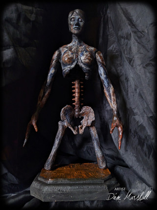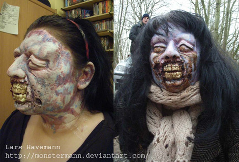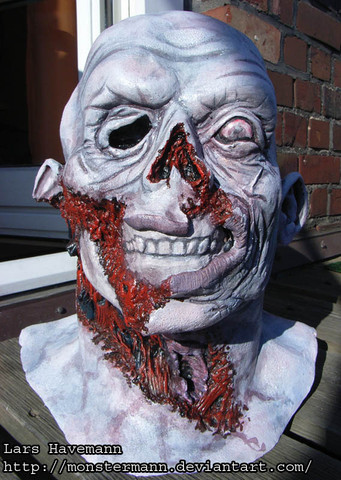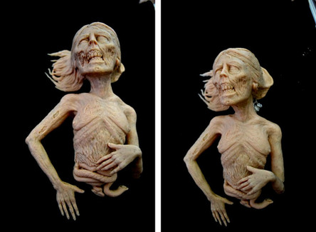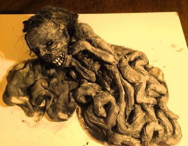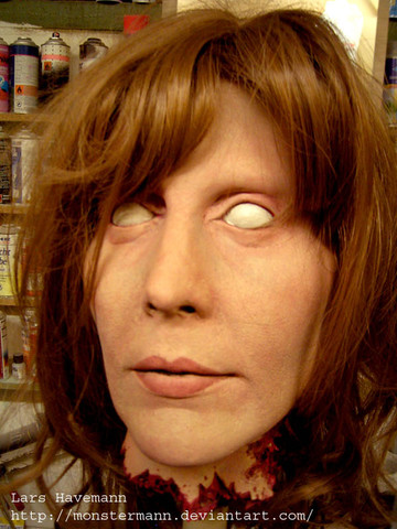 This is a lifesize corpse I made for the movie "Firefly Lake" (unreleased).I sculpted the skull in plasticine and cast it in base stone. The body is made of wire, wood tissue-paper and lots of latex.