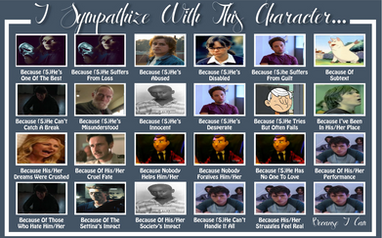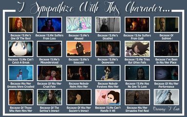 Because He's Misunderstood: Oswald Cobblepot/Penguin (Batman Returns). He may be a grotesque bird-person but he has feelings and he had a tragic upbringing, his own parents rejected him for being ugly so they threw him in the sewers, he grew up not knowing who they were.