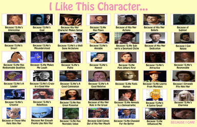 Because I Can Relate: Edmund Blackadder (Blackadder). He's what you might call a Villain Protagonist, but really...he's pretty much the way he is because look who's he's stuck with for pete's sake. He's stuck with Baldrick (proud owner of underwear that hasn't been washed in over a century and also obsessed with turnips. That was a recurring trait in the second and third seasons. In the fourth season, it was his terrible cooking skills), Percy (for at least two seasons), and George (for the third and fourth seasons). Blackadder's trademark insults and comments are pretty much his responses to the stupidity that is going on around him.
