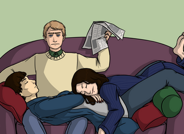 I love how Sherlock's hugging a sleeping John like he's holding a giant teddy bear. Irene's a naughty girl, touching Sherlock's butt.