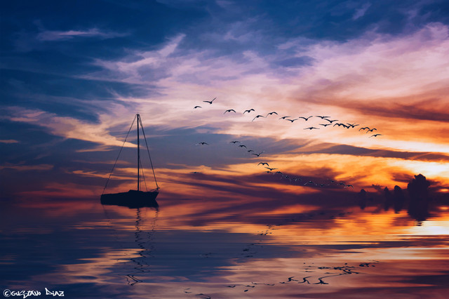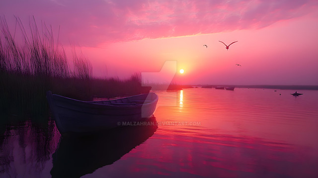 #boat #wallpaper #waterscape #2d #3d #cinematic #dark #digital #dystopia #emotional #fantasy #illustration #landscape #noai #photomanipulation #scenery #scifi #seascape #space #sunset #art