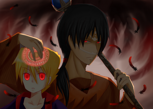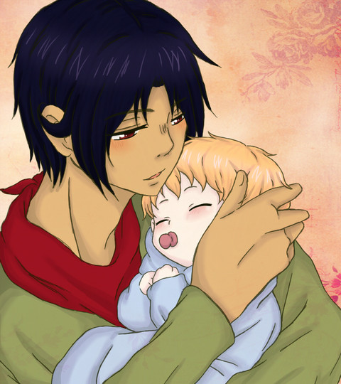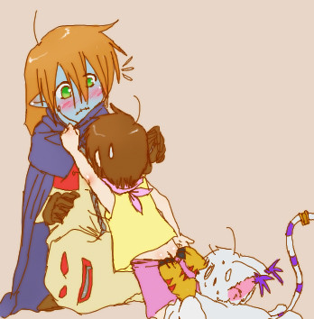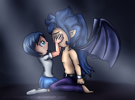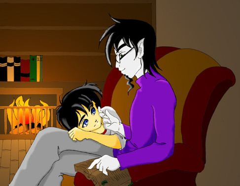 I couldn't resist doodling this once I read the part, I stopped where I was reading and drew this before continuing. X3 Then I thought the doodle looked pretty good and colored it. Nothing big though, a have quite the few mistakes (definitely with the shading since there's no source of light XD ), such as forgetting to give him a glove...I didn't look over that in the fic lol, but it's still uber cute. She wanted to make Myo somewhat good (who's name is Erebus in this story) and so she chose to have him have a soft spot for children. He'll side against his father (I believe from what she told me) later in the fic too.