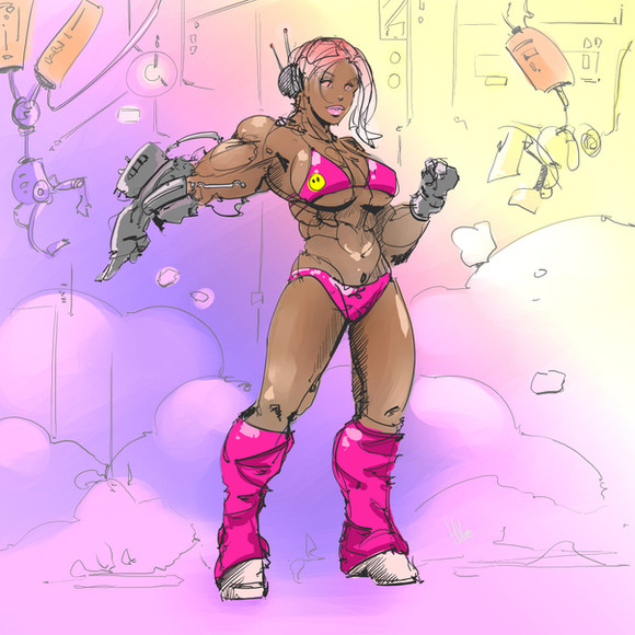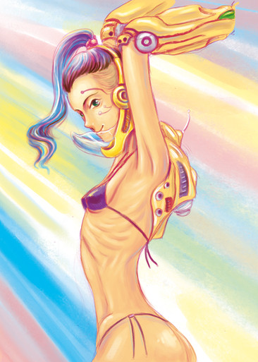 The sequel nobody asked for, Callie returning to the beach after me taking a long break from drawing. Dystopian cyberpunk alleys are notoriously the best shortcut to make your way to the beach.She is a cyborg girl who has anywhere from 2-6 arms at a time, this is the first time I tried actually drawing a proper drawing of her with six arms.