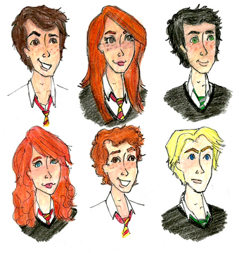 sorry for the dark things in the background i was doodling with a sharpieginny, harry, pansy (for lack of a better 'major character' from harrys class, ron, luna, neville, hermione, draco