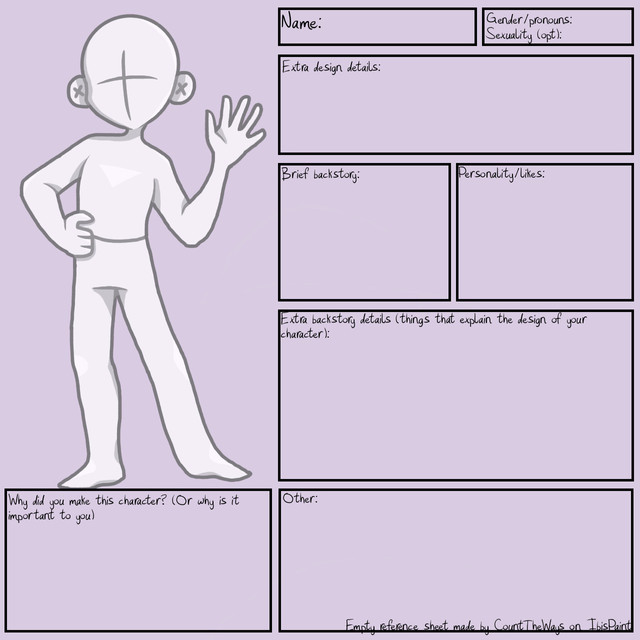 My intention here is to give people who usually just think about the visual design of their characters a springboard for fleshing out and balancing their characters; and to give people who think about their characters' personalities a lot a chance both to write it down and to really solidify their visual design.