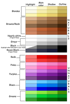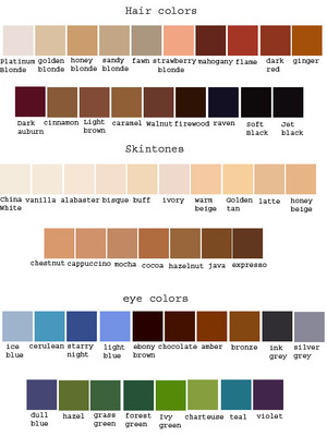 Of course, this is basically limited to naturally occurring human colors or hair dyes that mimic natural colors; but that isn't to say you can't have a character with bright blue hair or violet eyes (which are rare, but do occur in nature), this is just a springboard I use when designing humans.