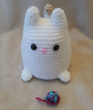 A cute amigurumi cat I made, with a lavender sachet inside~fun fact: my browser wants to correct "amigurumi" to "fumigator"