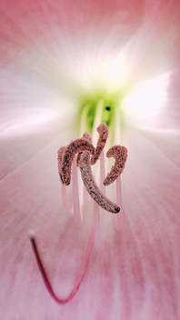 :: wandering into the nexus of the amaryllis easily :: the fragrant rose hue creates a cavern for hiding; the green softens while in contrast :: stamen-topped-triad pixie tube: flute! ~~! i am a bee dancing; i am a bee dancing lightly