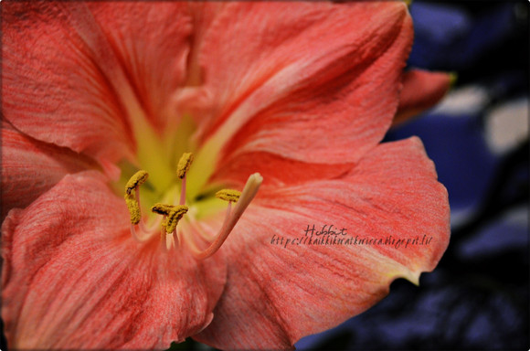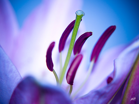 It's a beautiful piece. I would like to say. I love how the focus is on the closest petals and the "sex parts" of the flower (I'm currently forgetting the names I think one is the style and the other is the anther... I should know this as a science major). The hot pink color is nicely contrasted to the pretty blue background, I just wish that a little more of the flower was in focus.