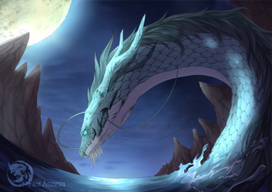 Beautiful, I like this pic. I already have a thing for long agile dragons in a lake, and the manes and the moon are pretty too