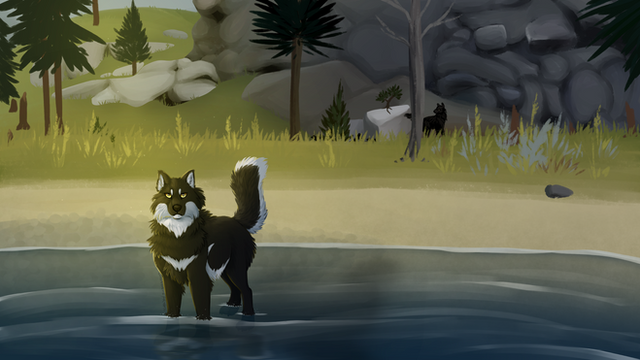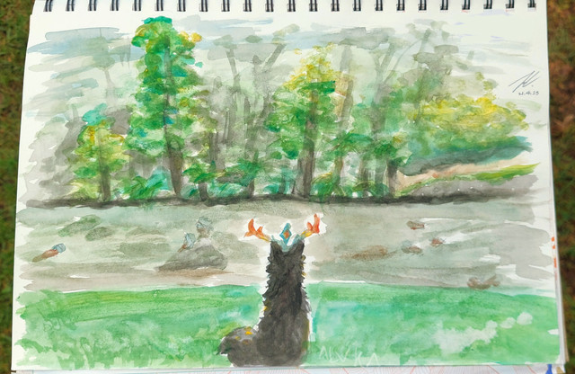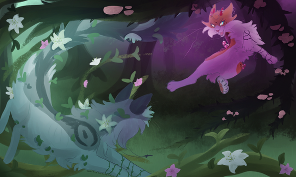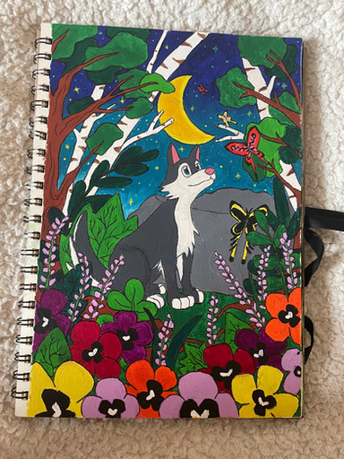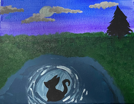 Originally painted August 3rd, 2023.And this was my final painting for the class. The concept was inspired by a sketch in one of my older sketchbooks of Graystripe and Silverstream. The theme we had to do was either distance or reflection, and I wanted to sort of combine the two by only giving one cat a reflection, symbolizing that only one of them is physically there. I wanted the ghost cat to be silvery, and I wanted the living cat to contrast by being darker and less fluffy and flowy, so the designs are based on Feathertail and Crowfeather. I also did some lining with a pen. I love how the cats came out in this piece, though the background is very muddy. I also still struggled to go as dark as I wanted, especially with such a big space to fill. Afterall, this piece is quite large. 16in x 20in. Overall though, I like how it came out.