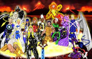 la peliroja seria Sunset shimmer en el traje de emma frost, la de azul la princesa luna, la de violeta twilight sparkle, y el dragon spyke