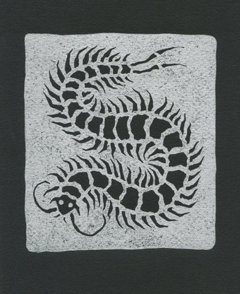 Three positive prints and one negative print of the same shell, I flipped it upside down to get the shadow of the shell curving inward for the negative print. All of the positive prints are different editions of the same carving, not the exact same image, kept for the variation in background noise.Related content
