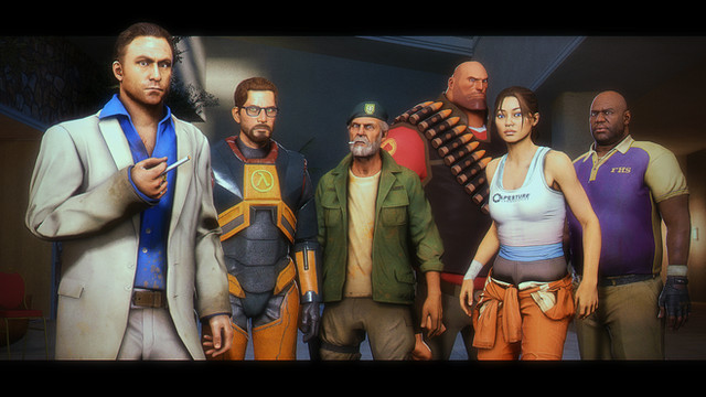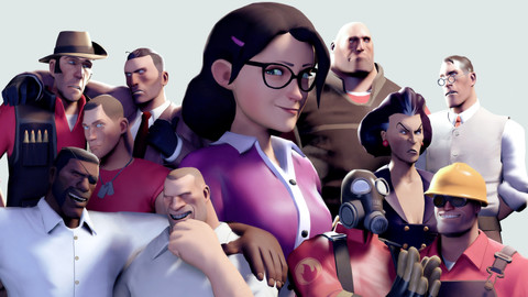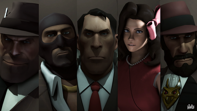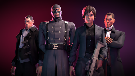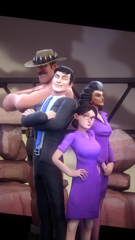 A shot with the other models/characters accompanying the Bidwell model reveal, including Reddy and Jerry. Both their heads were actually built off Bidwell by me, with their bodies being built off enhanced/suited Soldier and the Farmer/some Scout cosmetics, respectively.