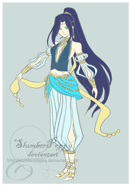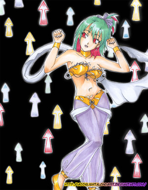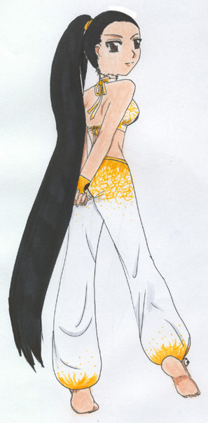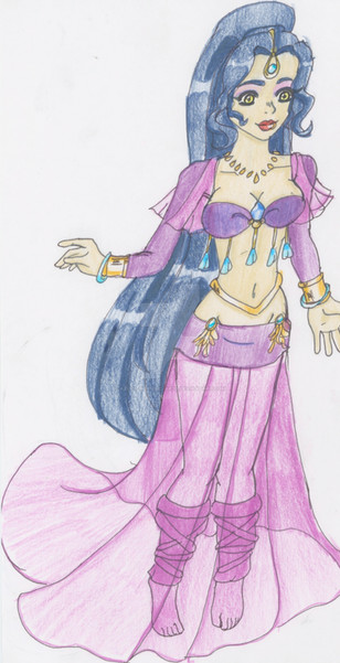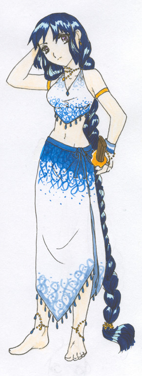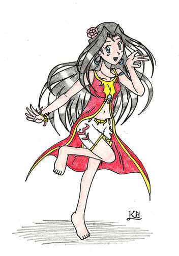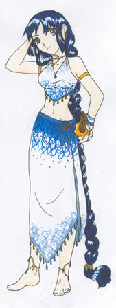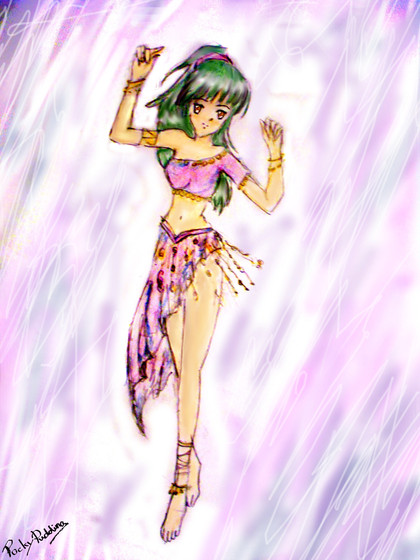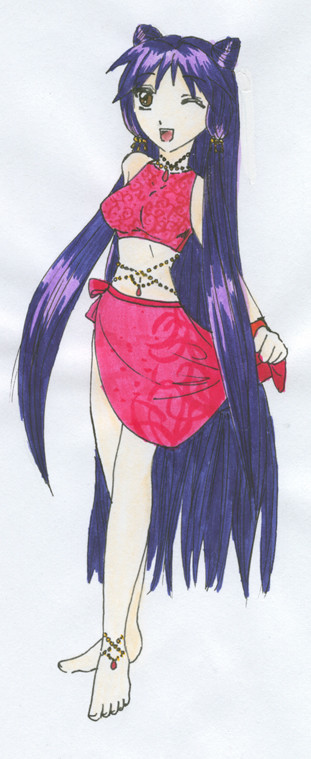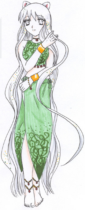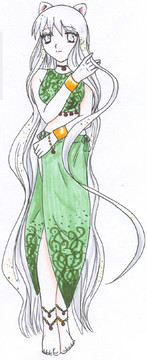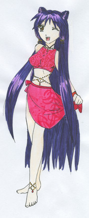 I very much like the way Pure's design turned out. ^_^ The only thing I don't like about the picture is how streaky her skin turned out. >.< I need to work with my brown pastel more and get it to be more chalky, so I can color the skin smoothly. ^_^ Her hair was a color I made by mixing two greens, actually. ^_^ Her jewel is the amethyst, btw.Also, the black on her ankle is her birthmark, but from the angle you can't see it all.
