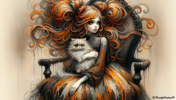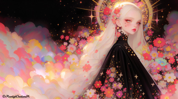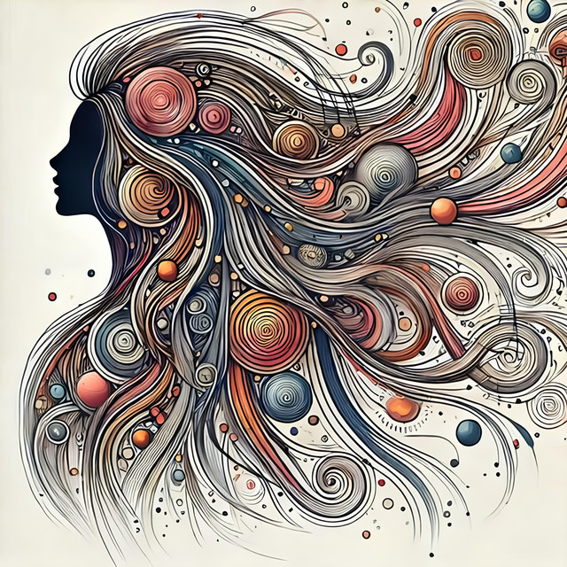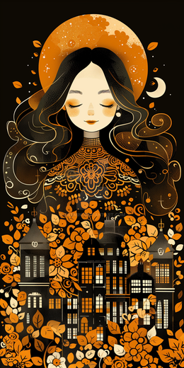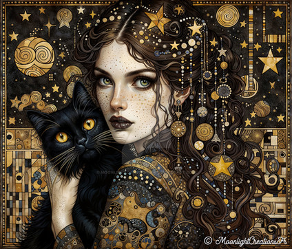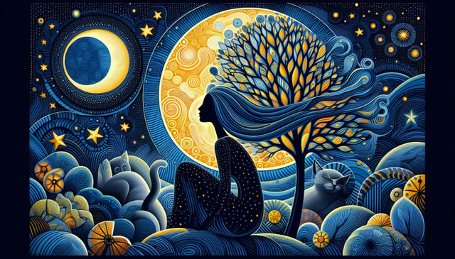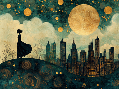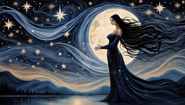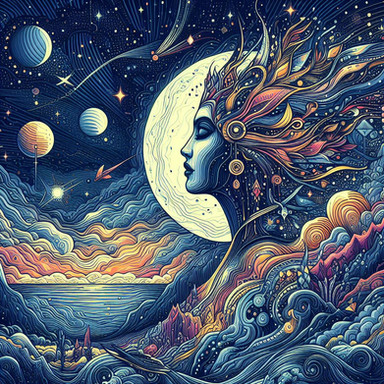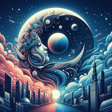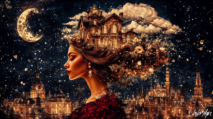 Under a canvas of starlit skies, 'Moonlit Reverie' is a digital dreamscape where the cosmic dance of swirling patterns and glittering stars meets the quiet village below. In this surreal portrayal, a solitary figure stands against the magnificence of the full moon, her thoughts as intricate as the swirls that crown her. This piece weaves the mystique of the night with the charm of an art nouveau-inspired fantasy.