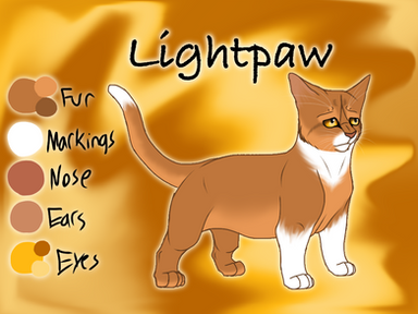 Lightkit had a happy life as a kit, taken care of by Amberwing, and sometimes Sweetfern. He met Ferretfang in the medicine den when she was sickly, and liked her, she was a little scary at the time because of her tough tone, but nonetheless Lightkit didn't mind her.