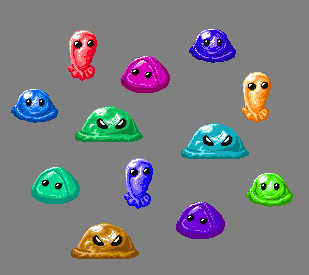 These are edits for the game I am working on. They are the slimes. It took a lot of time to edit them to fit the entire page properly. The black one was the hardest though since I couldn't get it to edit properly and so I just through some black adjusted the opacity and bam. Edit complete. Lol. It was a pain but the results are good. So now to go over the edit of this.