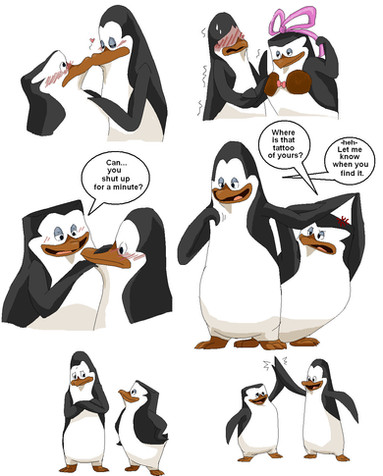 I think I can actually pick out some of the different mediums you used like the sharpies and colored pencils and whatnot. x3 Or maybe I'm just imagining things x'D Kowalski is so cute making a puppet of himself and Skipper...and then making them kiss