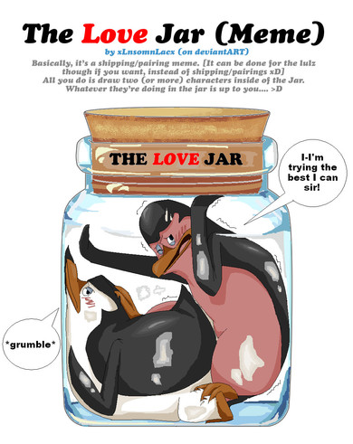 I keep hopping around my arts. I should get in the habit of staying on a image and finishing it up. But I feel hopping around on art pieces is good for the mind, yes? x3 As long as they get done, that's all that matters (Hahaha, for a split second I thought you kept adding on to your note on what you forgot to mention or something x3 But I figured it was a dA issue xP ) The little design socks? Teehee, I think those always slide off my feet xD Feel free to tug more! I'm sure he's getting a little used to it now xD (Hehe, no way! They're one of a kind, exclusive, limited edition Skipper and Kowalski puppets! They cannot be damaged! )