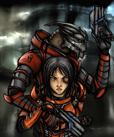 My Shepard from Mass Effect 2, learning turian military techniques and strategies with the sniper rifle from Garrus Vakarian.Jane 'Foucault' Shepard is Renegade with some paragon choices. She's distant and typically a hard ass. There are few people who actually consider her a friend -- and only one person whose 'affections' she's acknowledged (To be fair, he had to trick her into admitting it).