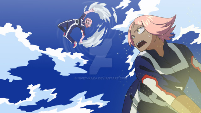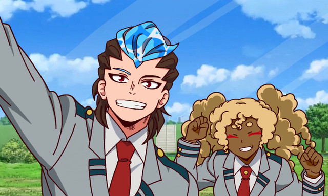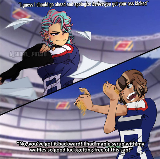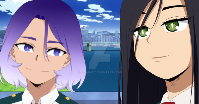 Gotta love a friendly rivalry. Oriko (left) and Ru (right) were actually friends in first year, but after Oriko went vigilante for a bit, Ru felt hurt and was only worsened by them starting to learn under the same mentor; so a rivalry formed.This would be the Second Year at UA probably; so Oriko is a general student and Ru is a hero student.